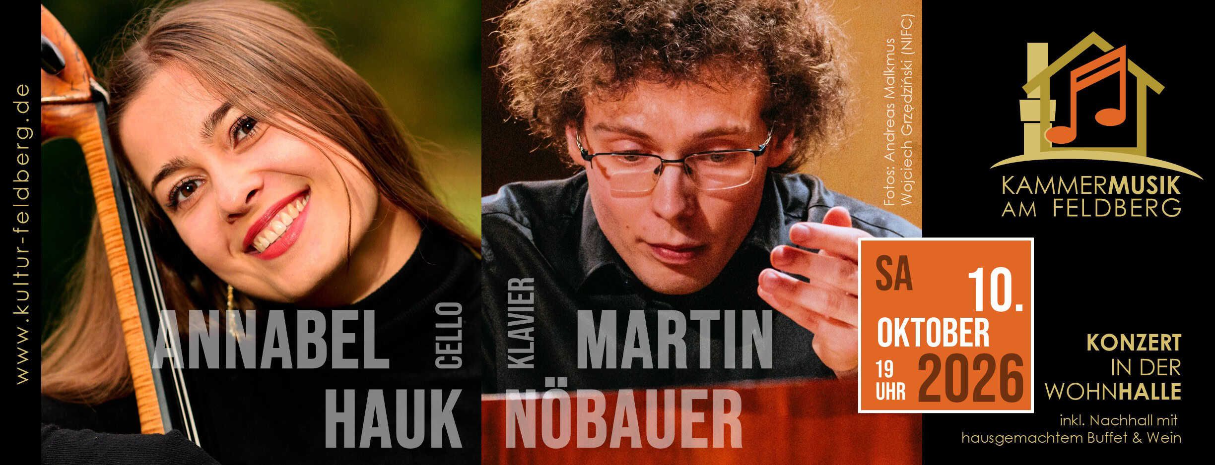 Martin Nöbauer und Annabel Hauk haben sich 2023 im Studium am Mozarteum in Salzburg kennengelernt und musizieren seither gemeinsam. Konzerte führten sie unter anderem in die Villa Senar von Rachmaninoff in der Schweiz, zu den Meersburger Schlosskonzerten, zum Festival Gegen den Strom und der Coburger Rising Stars Serie. Eine besondere Leidenschaft des Duos sind Werke der Wiener Klassik, insbesondere Beethovens Cellosonaten, mit denen Konzerte und eine Aufnahme im Sommer 2026 geplant sind. Kraft und Inspiration sammeln die beiden Musiker beim Wandern, besonders gerne in den Bergen, oder beim traditionellen "Donnerstagsfisch", der frisch vom Salzburger Schrannenmarkt geangelt wird.